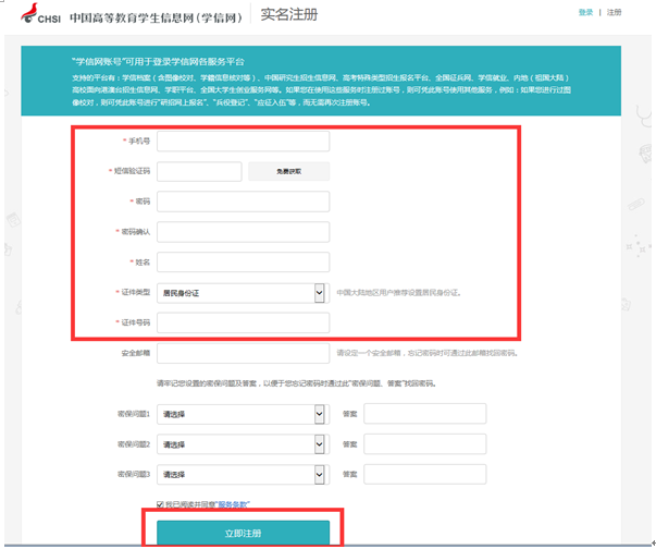 注冊頁面:只需填寫紅框里的內(nèi)容,必須用學(xué)生本人手機(jī)號(hào)。